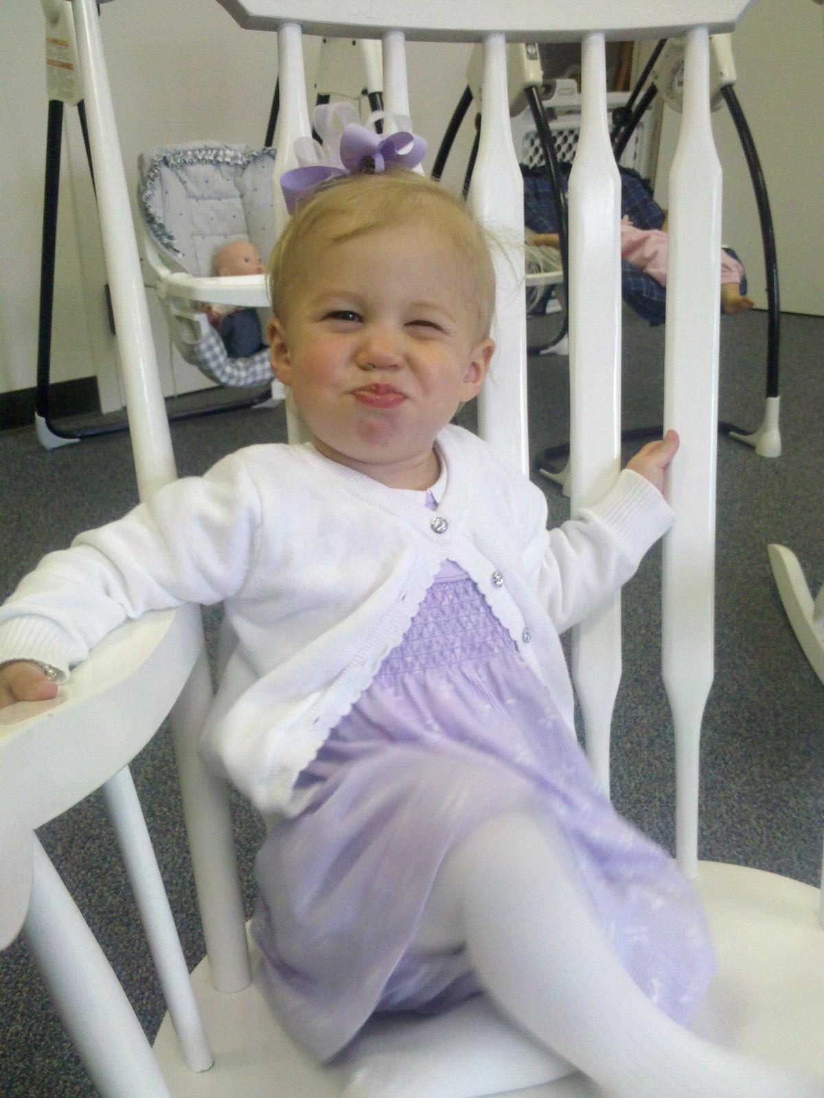 No worries, the Easter Bunny DID find our residence and as always he did not disappoint. We were up and down stairs by 6:30. Everybody was excited but it actually helped us get to church on time. Because the weather was so terrible last weekend the Egg hunt had to be canceled so they had rescheduled it for Easter Sunday! They even threw some eggs down in one of the nurseries just for Mckinley. She had her own private egg hunt. She had people rolling with laughter because every time she'd find one she'd go "oh" and make a surprise face. She did this with EVERY egg she found! Look at the picture right above and you can tell the mood she was in!